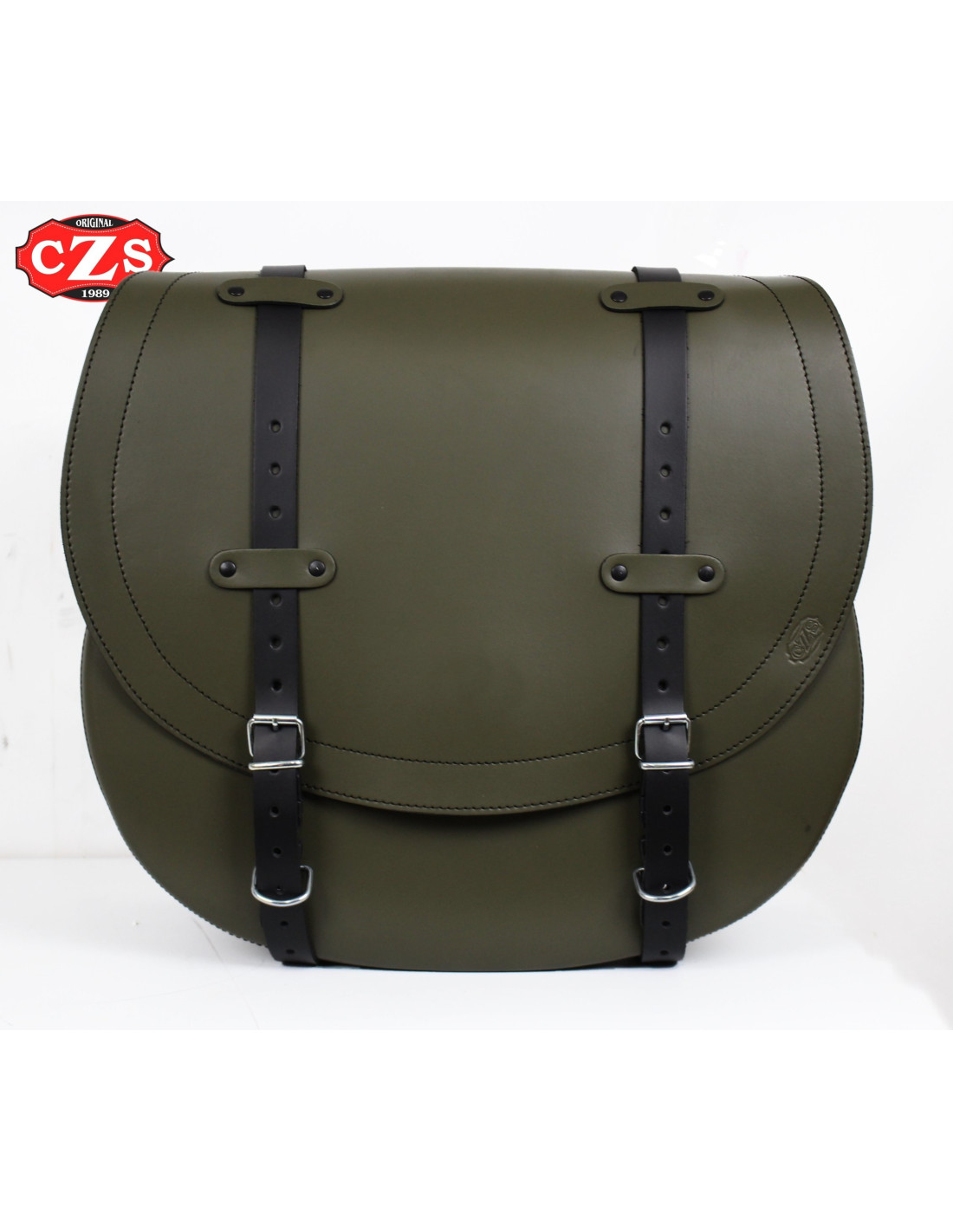 Grünes Rindsleder mit schwarzen Riemen.