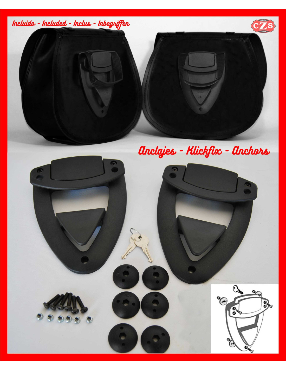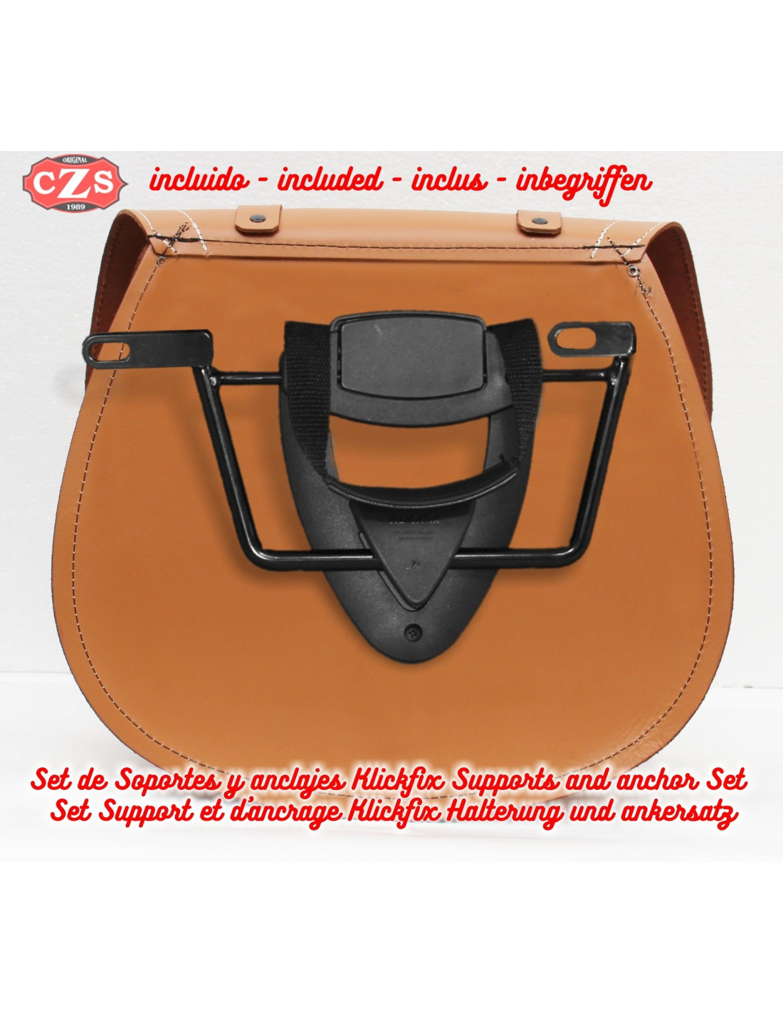 Abnehmbares System mit spezifischen Halterungen, Klickfix-Anker mit Innenverschluss und in den Satteltaschen installiert.