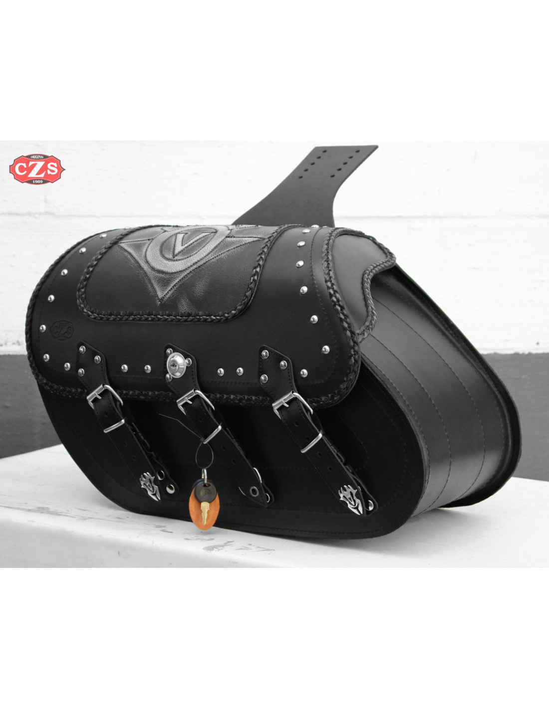 Decoration: - Vulcan logo - engraving, braided profiles, chrome spherical studs, buckles and chrome appliqués at the ends