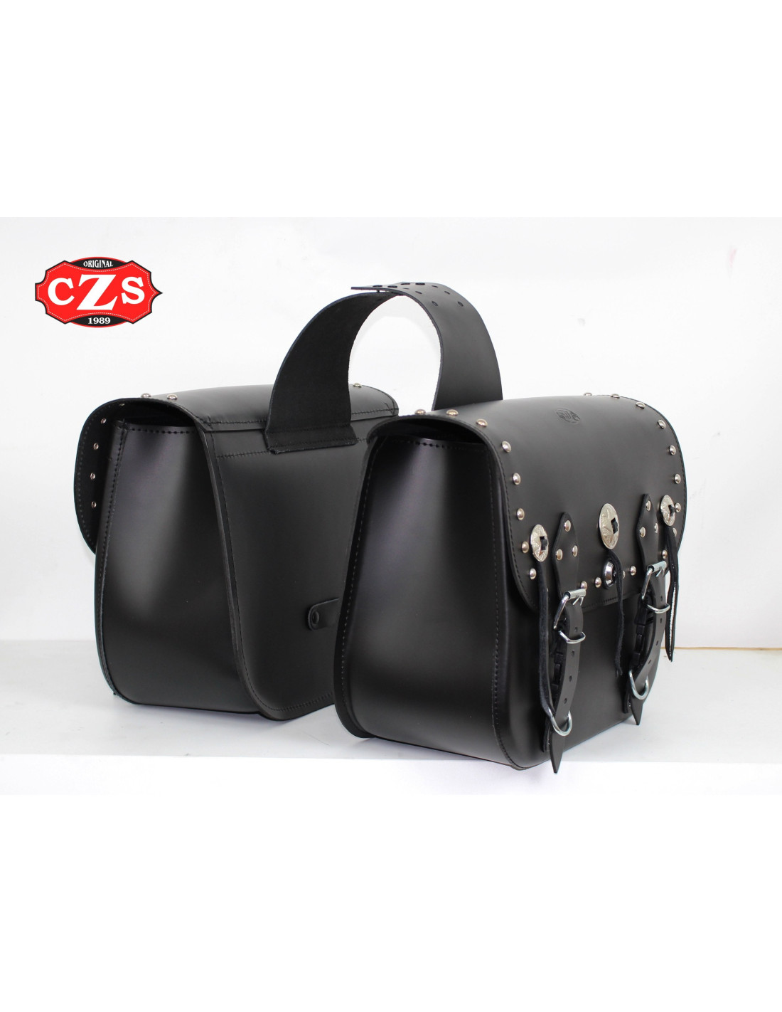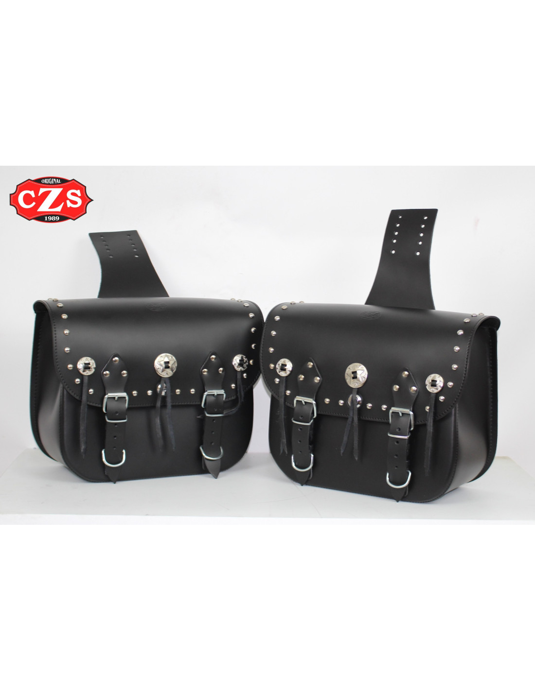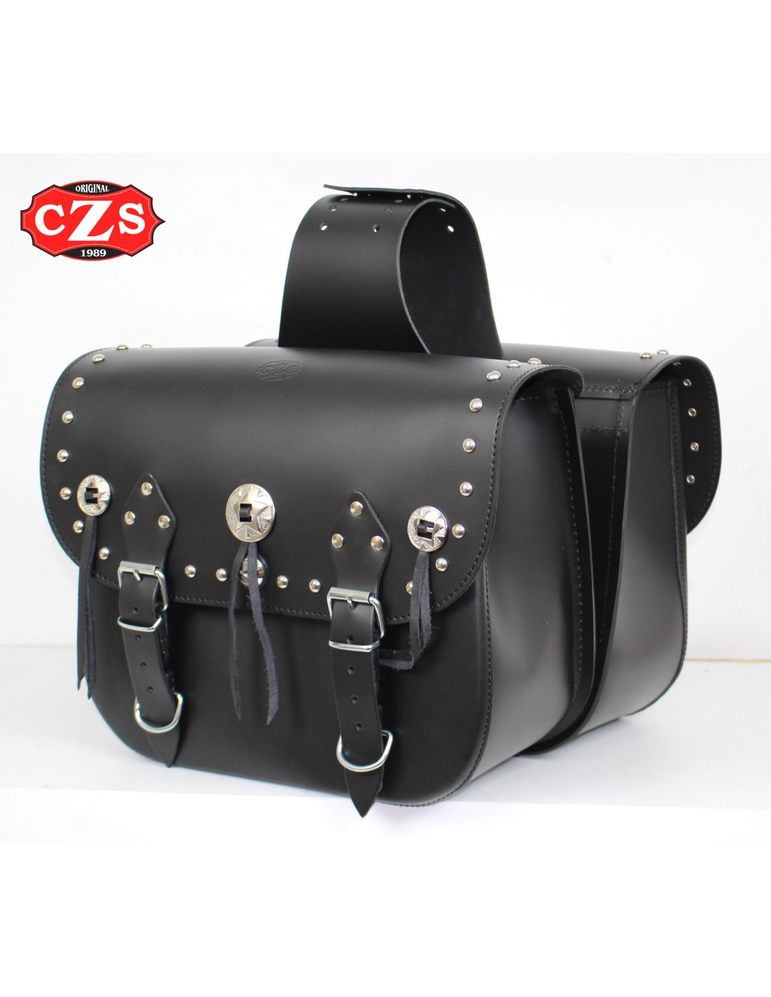 Decoración: tachuelas esféricas cromadas y 3 conchos con flecos