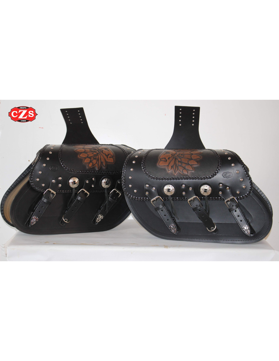 Decoración: grabado vintage, perfiles trenzados, tachuelas esféricas cromadas, hebillas y apliques cromados en las puntas