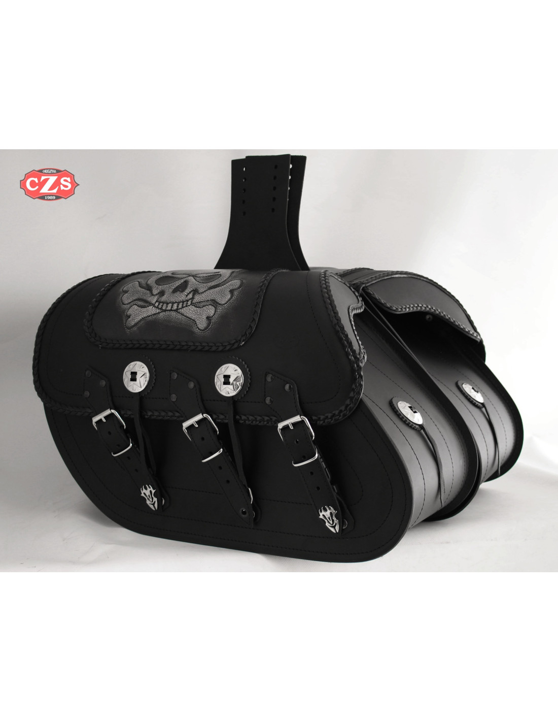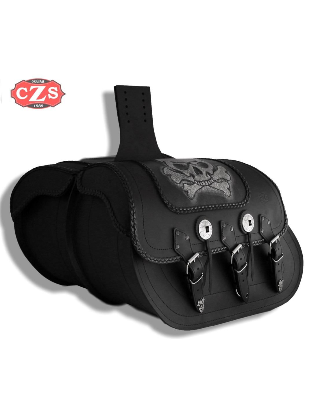 Decoración: grabado vintage, perfiles trenzados, 2 conchos con flecos, hebillas y apliques cromados en las puntas