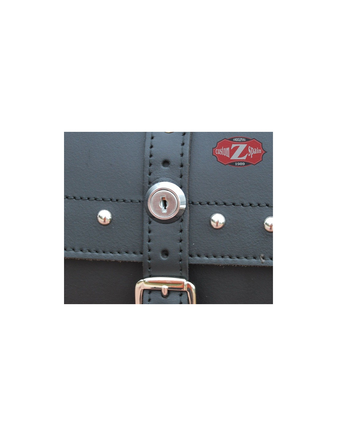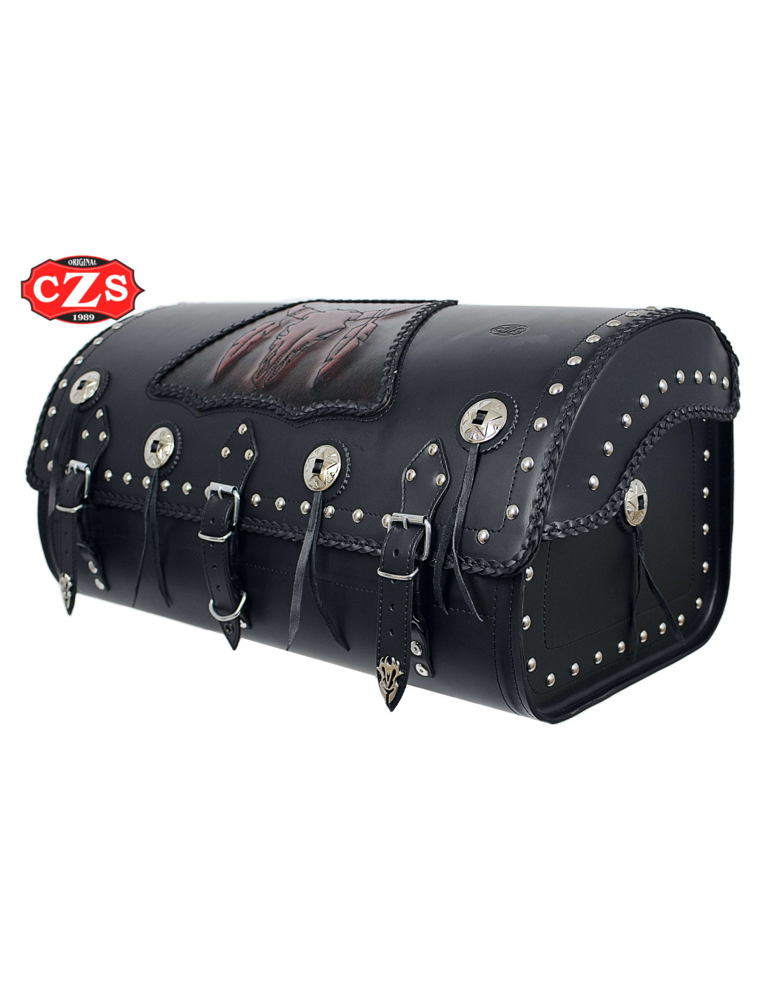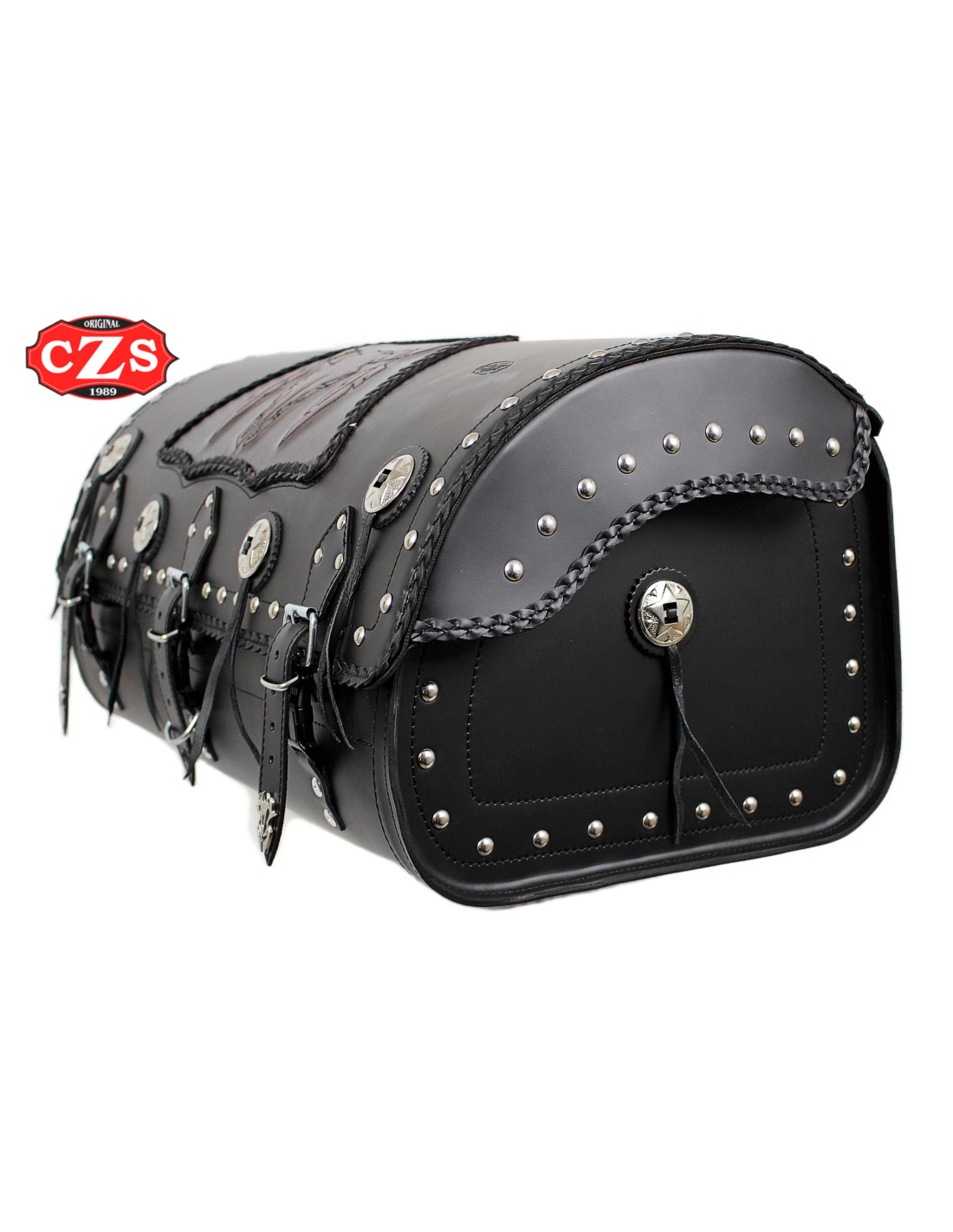 Decoración: grabado vintage, perfiles trenzados, 4 conchos y flecos, tachuelas esféricas cromadas, hebillas y apliques cromados