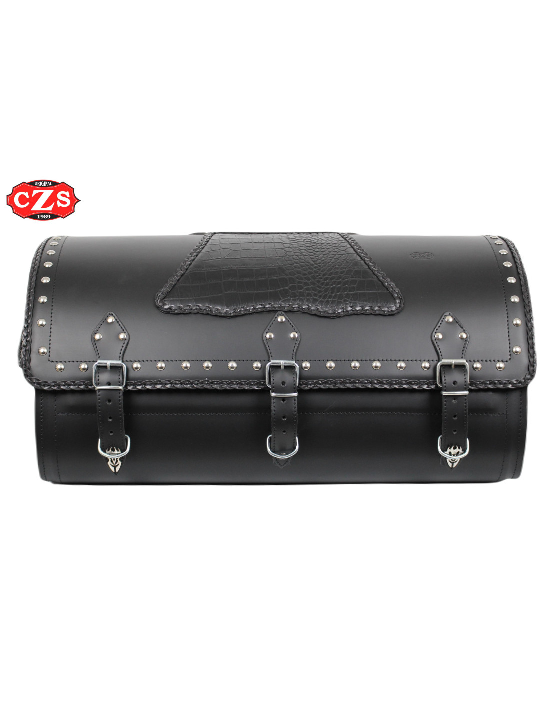 Décoration : gravure imitation crocodile, profils tressés, clous sphériques chromés, boucles et appliques chromées sur les embouts