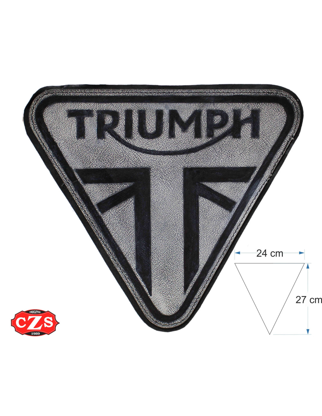 Patch vintage avec motifs et le texte TRIUMPH dans un triangle inversé.