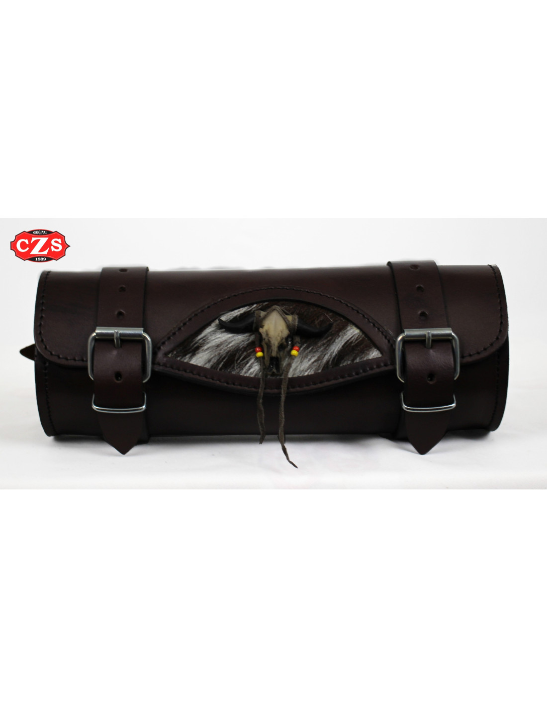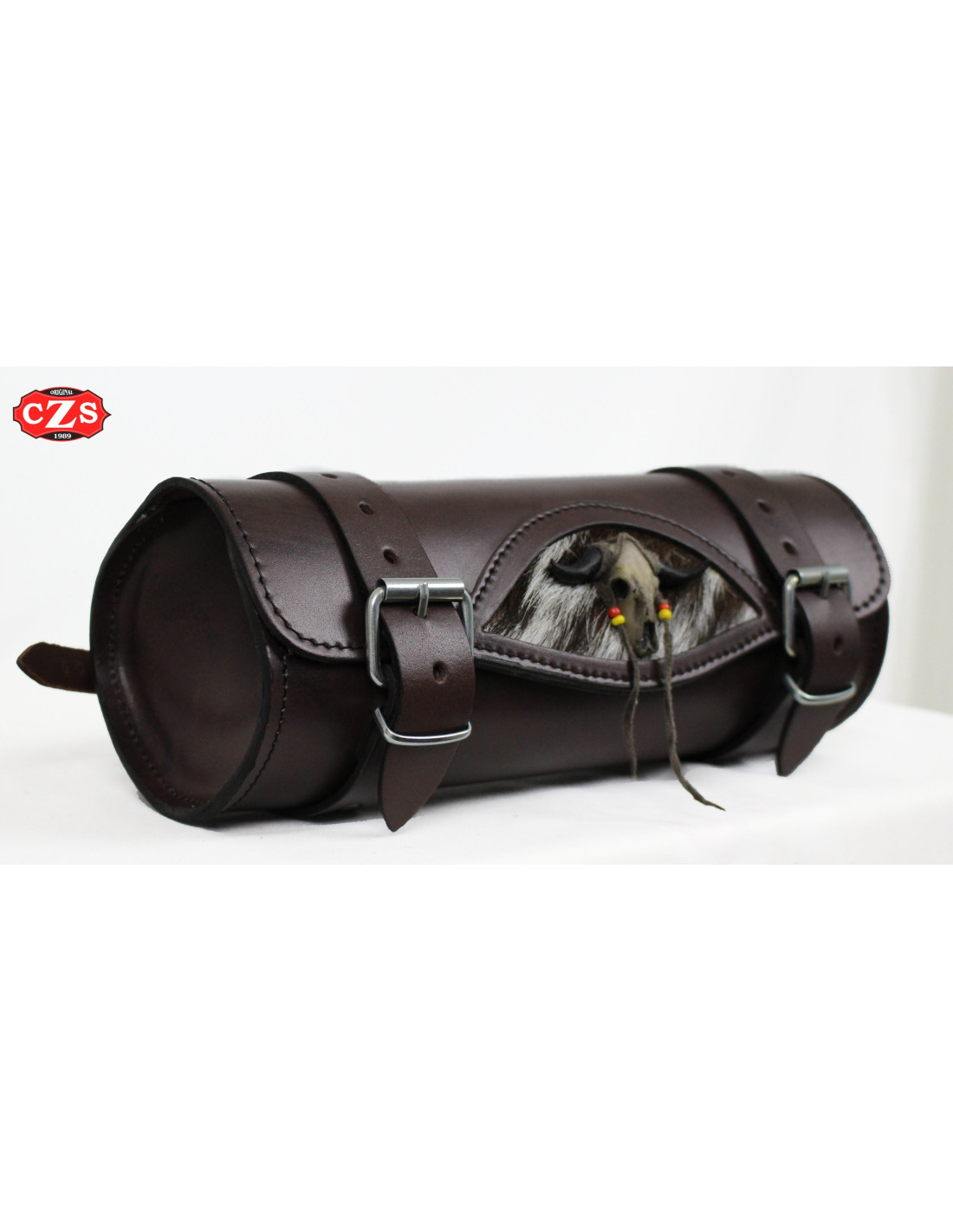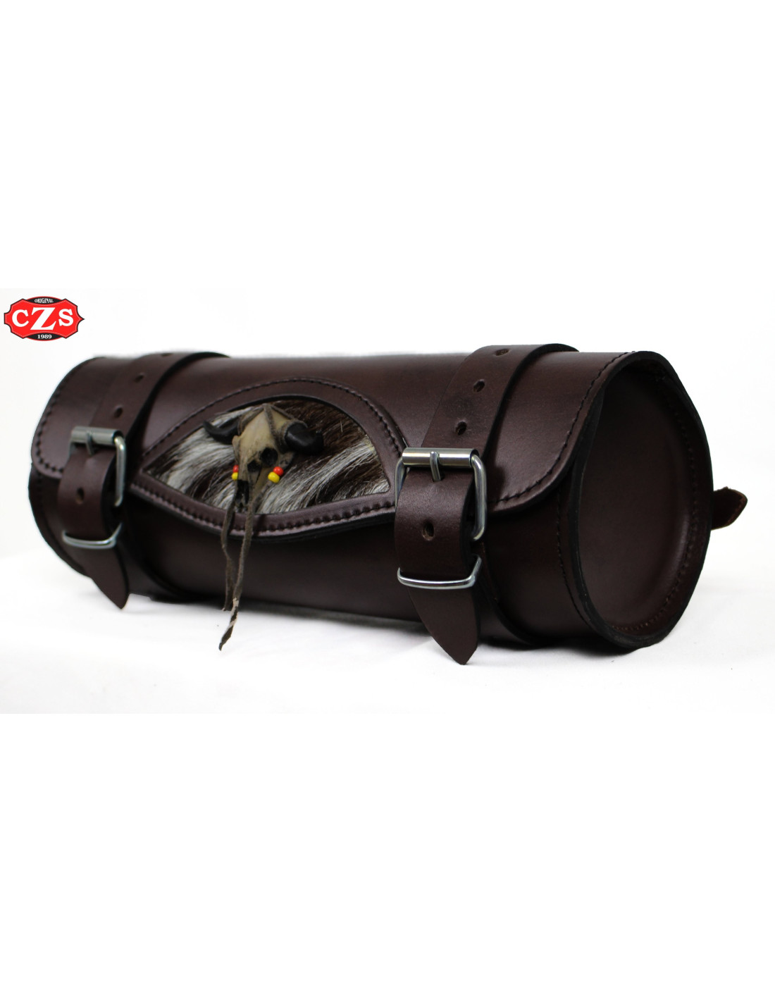 Rouleau en cuir pour moto 29 cm x 11 Ø - Crâne de Taureau avec Poils de Chèvre - Marron Chocolat